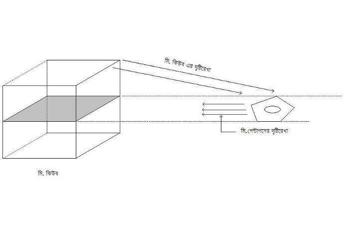 ত্রিমাত্রিক কোন প্রাণির ক্ষেত্রে মি. পেন্টাগন আগের মতই কেবলমাত্র একটি রেখার মত বস্তু দেখতে পাবেন । কেননা তার দুই মাত্রার সীমিত জগতের সাথে ত্রিমাত্রিক জগতের ছেদ করা অংশটুকুই কেবল তার দৃষ্টি গোচর হবে। অর্থাৎ মি. কিউব এর যখন যে অংশটুকু মি. পেন্টাগনের দ্বিমাত্রিক জগতে থাকবে তখন সেটুকুই কেবল তিনি দেখবেন । মি. কিউব মি. পেন্টাগনকে কিরূপে দেখবেন সে প্রসঙ্গে বলি । মি. কিউব কিন্তু মি. পেন্টাগনের দৈর্ঘ্য ও প্রস্থ একই সাথে দেখতে পাবেন । এখন যেমন আমরা পাচ্ছি । আবার তিনি কিন্তু ত্রিমাত্রিক হওয়ায় মি. পেন্টাগনের ভিতরে থাকা বৃত্তটিকেও দেখতে পাবেন । তাকে পুরোটা দেখতে এমনকি ঘুরেও আসতে হবে না ।